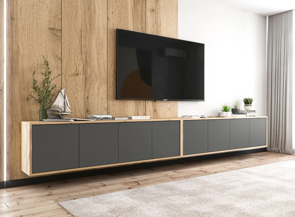 2 Stk Hängende RTV TV-Schrank – 2 X Apollo 2 – MAT 300 – TV Hängeschränke – Hängend – Modern – Lindner Möbel – 300cm X 39cm X 35cm, Farbe: Wotan Eiche Matt – Graphit Matt