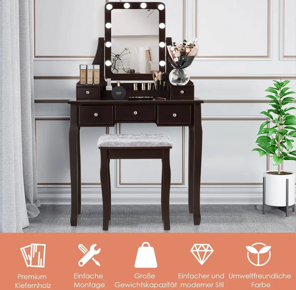 Schreibe die erste Rezension für „COSTWAY Schminktisch Mit Hocker, 360° Drehbarem Spiegel Und 10 Dimmbaren LED-Birnen, Frisiertisch Mit 5 Schubladen Und Organisator, Kosmetiktisch Aus Tisch Und Abnehmbarer Oberteil (Braun)“ Antwort abbrechen