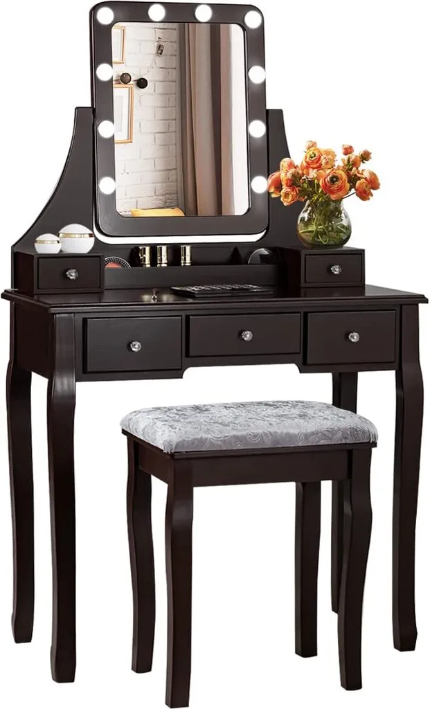 COSTWAY Schminktisch Mit Hocker, 360° Drehbarem Spiegel Und 10 Dimmbaren LED-Birnen, Frisiertisch Mit 5 Schubladen Und Organisator, Kosmetiktisch Aus Tisch Und Abnehmbarer Oberteil (Braun)