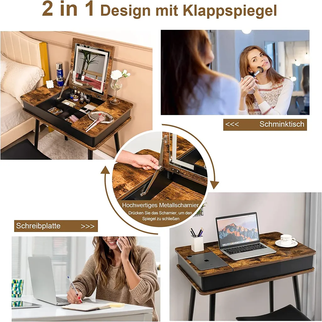 COSTWAY Schminktisch Mit Verstellbarer LED Beleuchtung, USB-Anschluss Und Klappspiegel, Frisiertisch Mit 6 Ablagefächern & Gepolstertem Hocker, Kosmetiktisch, Industrie-Design, Vintagebraun