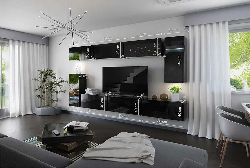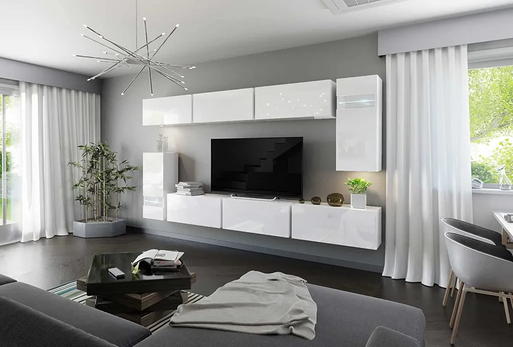 Grekpol- Wohnwand,Anbauwand, TV-Lowboard, Hängeschränke, Wandboard, Fernsehschrank, Wohnzimmerschran -WIKA 3 (Weiß Glanz, Mit LED Beleuchtung)