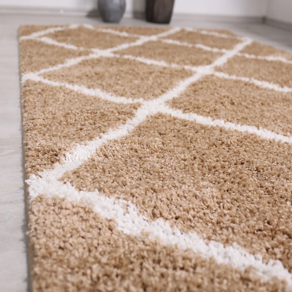 Hochflor Teppich Wohnzimmer Shaggy Rauten Muster Beige Creme Skandinavischer Stil Weich Robust, Maße:80×150 Cm