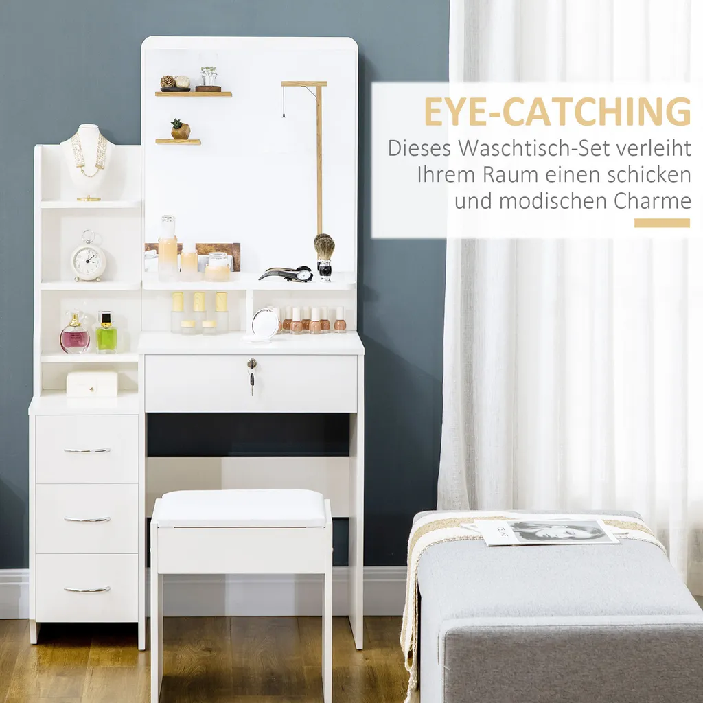 HOMCOM Schminktisch Mit Hocker, Kosmetiktisch Mit Spiegel, Frisiertisch Mit Schubladen, Ablagen, Frisierkommode Mit Anti-Kipp-Schutz Für Schlafzimmer, Weiß, 80 X 38 X 143cm