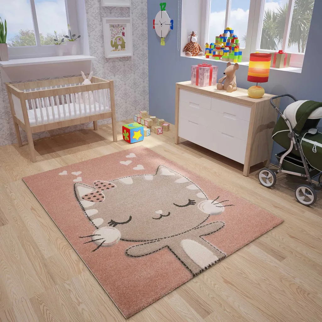 Kinderteppich Babyteppich Flauschig Weich Altrosa Beige Weiß Fröhliches Kätzchen Katze , Maße:120×170 Cm