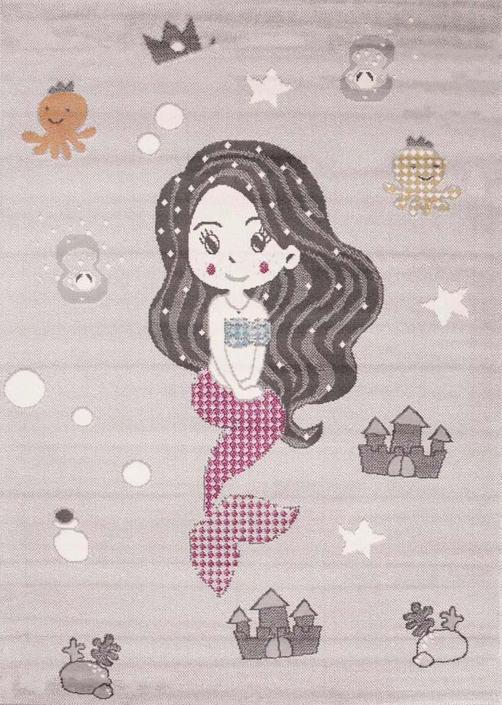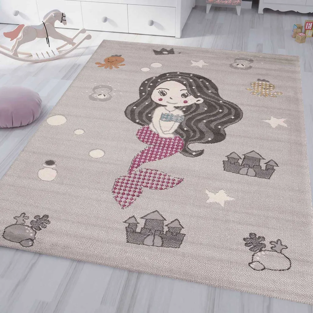 Kinderteppich Kinderzimmer Teppich Meerjungfrau Kurzflor Baby Grau Rosa , Maße:80×150 Cm