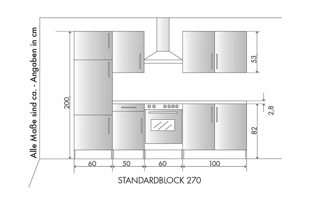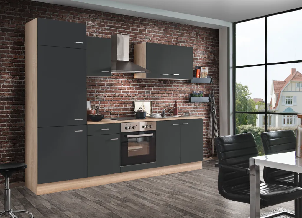 Küchenblock Biggi 270 Cm In Quarzgrau Ink. 200cm Kühlschrankumbau Mit Glaskeramik Kochfeld, Herd, Kühlschrank, Dunsthaube Und Spüle