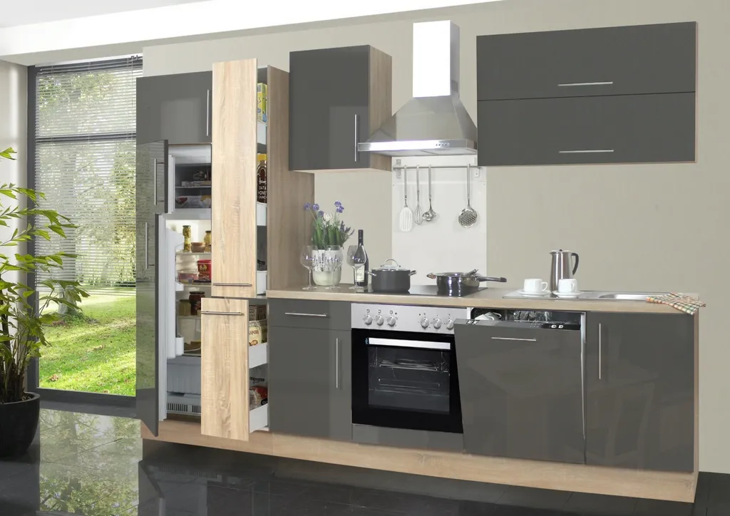 Küchenblock Jana 310 Cm In Lava Glänzend Mit Herd Glaskeramik Kochfeld Geschirrspüler Dunsthaube Kühl.- Gefrierkombination Und Apotheker
