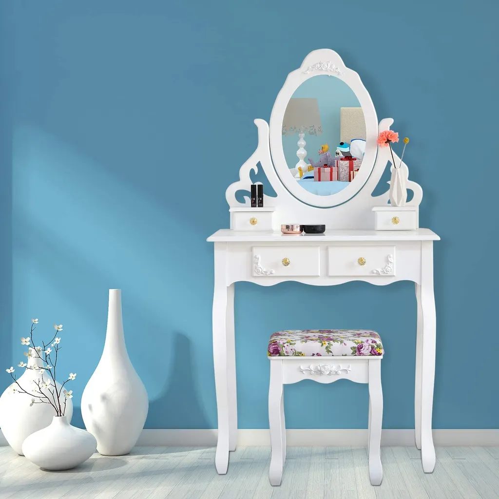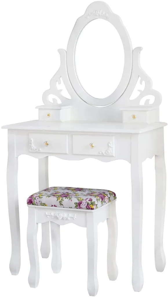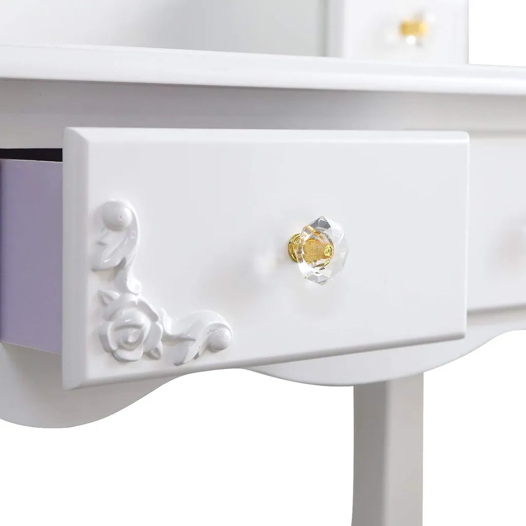 Meerveil Schminktisch Mit Spiegel Und Hocker, Frisierkommode, Aushöhlen Geschnitzter, Frisiertisch Mit 4 Schubladen, Rutschfeste Aufkleber, Weiß