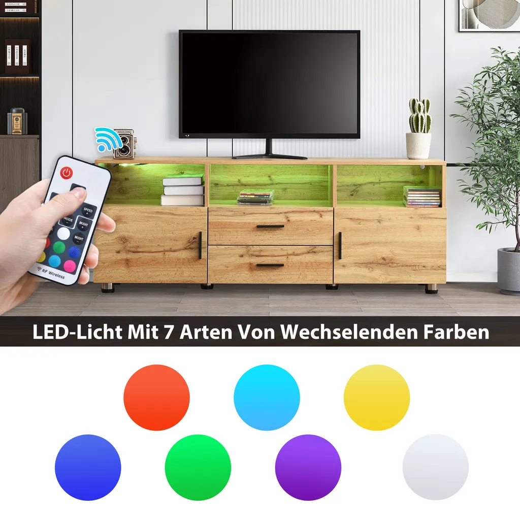Merax TV-Schrank Lowboard Mit 2 Schubladen, 2 Türen Und Verstellbaren Füße, TV Schrank Mit LED-Beleuchtung Inkl. Fernbedienung, Stehend, 138cm, Oak