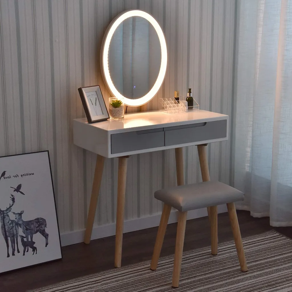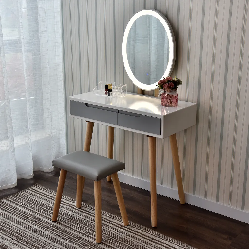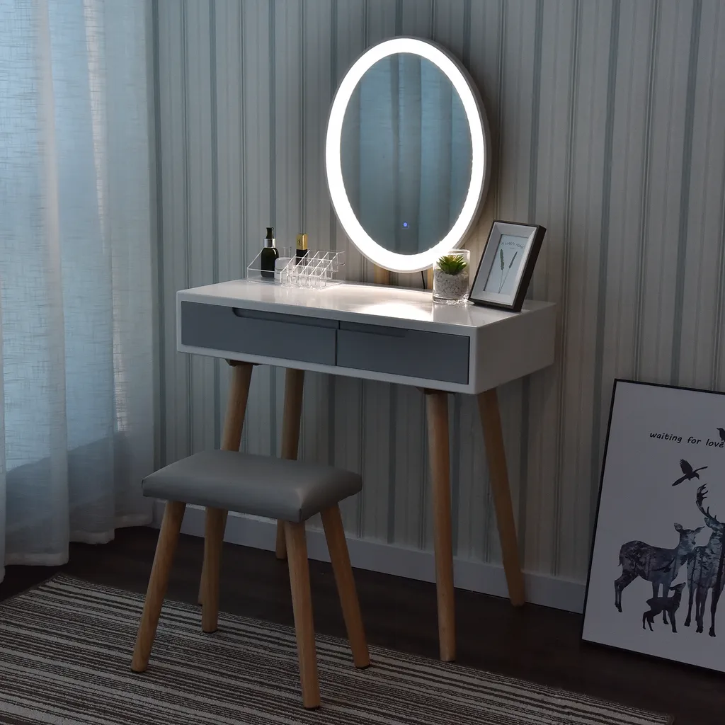 Puluomis Schminktisch Mit LED Beleuchtung Spiegel, Kosmetiktisch Frisiertisch Mit Gepolstertem Hocker Und 2 Schubladen, 3 Beleuchtungmodi, Oval Weiß Grau