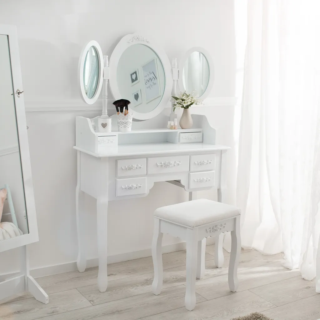 Tectake Schminktisch Mit 7 Schubladen, Spiegel Und Hocker Im Antik Look – Weiß