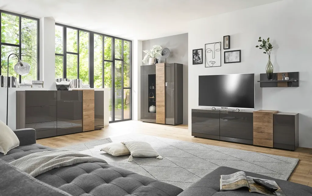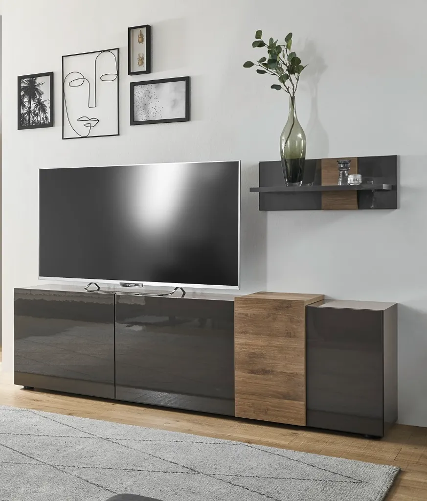 TV-Board Lowboard Positano | Grau Hochglanz / Eiche Mercure