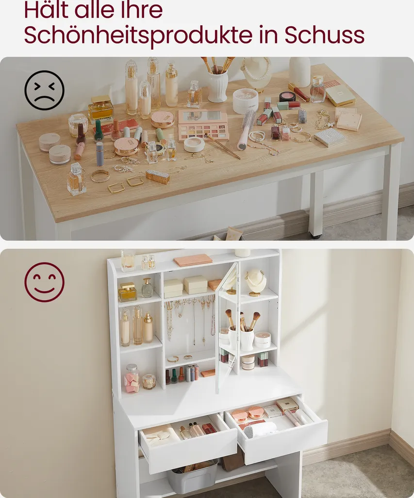 VASAGLE Schminktisch Mit LED-Beleuchtung, 3 Farben Mit Einstellbarer Helligkeit, Frisiertisch Mit Spiegel Für Make-up, Kosmetiktisch Mit Verstellbaren Ablagen, 2 Schubladen, Modern, Weiß RDT123T14