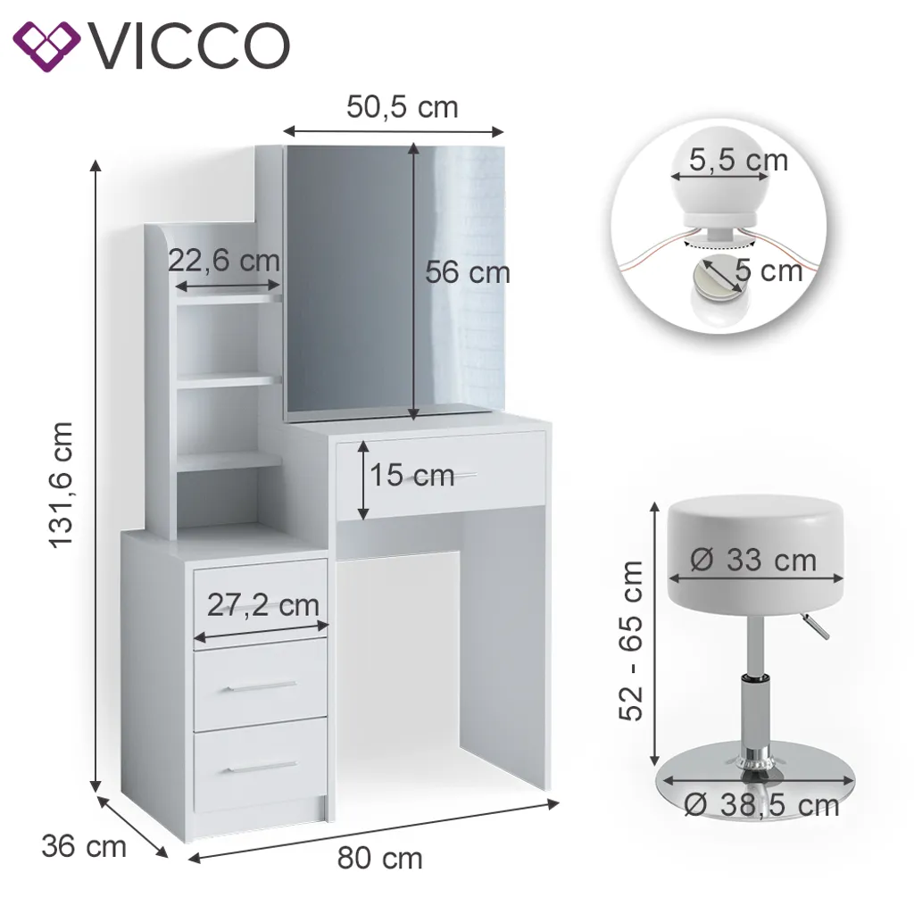 | Zusätzliche Varianten | Vicco Schminktisch Frisiertisch Schminkkommode Conrada + LED-Beleuchtung Kommode, Vicco Schminktisch Frisiertisch Schminkkommode Conrada LED-Beleuchtung + Hocker |