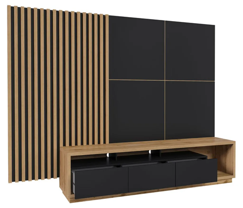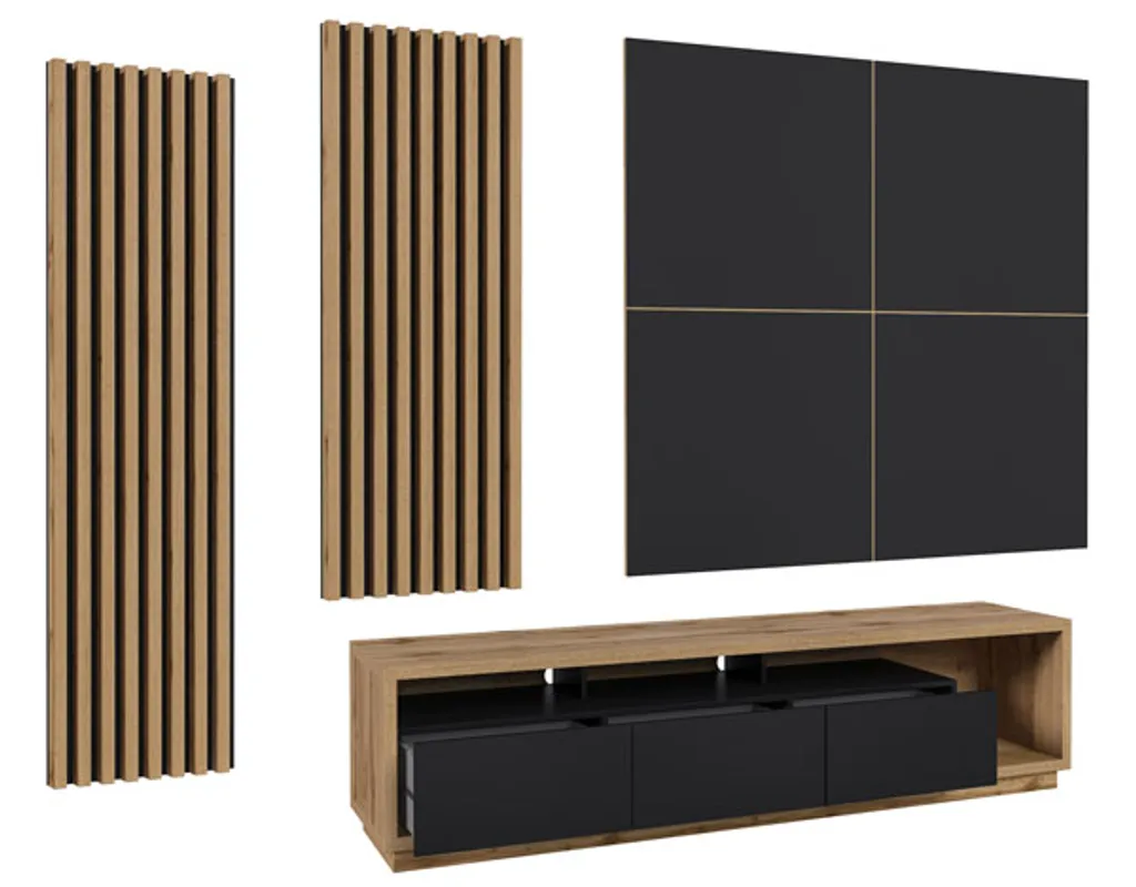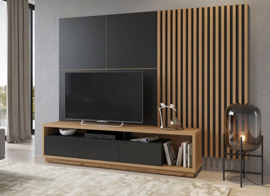Wohnzimmer Set CELINE Lowboard Mit Wandpaneel Und 2 Lamellenwänden Wotan Eiche Schwarz